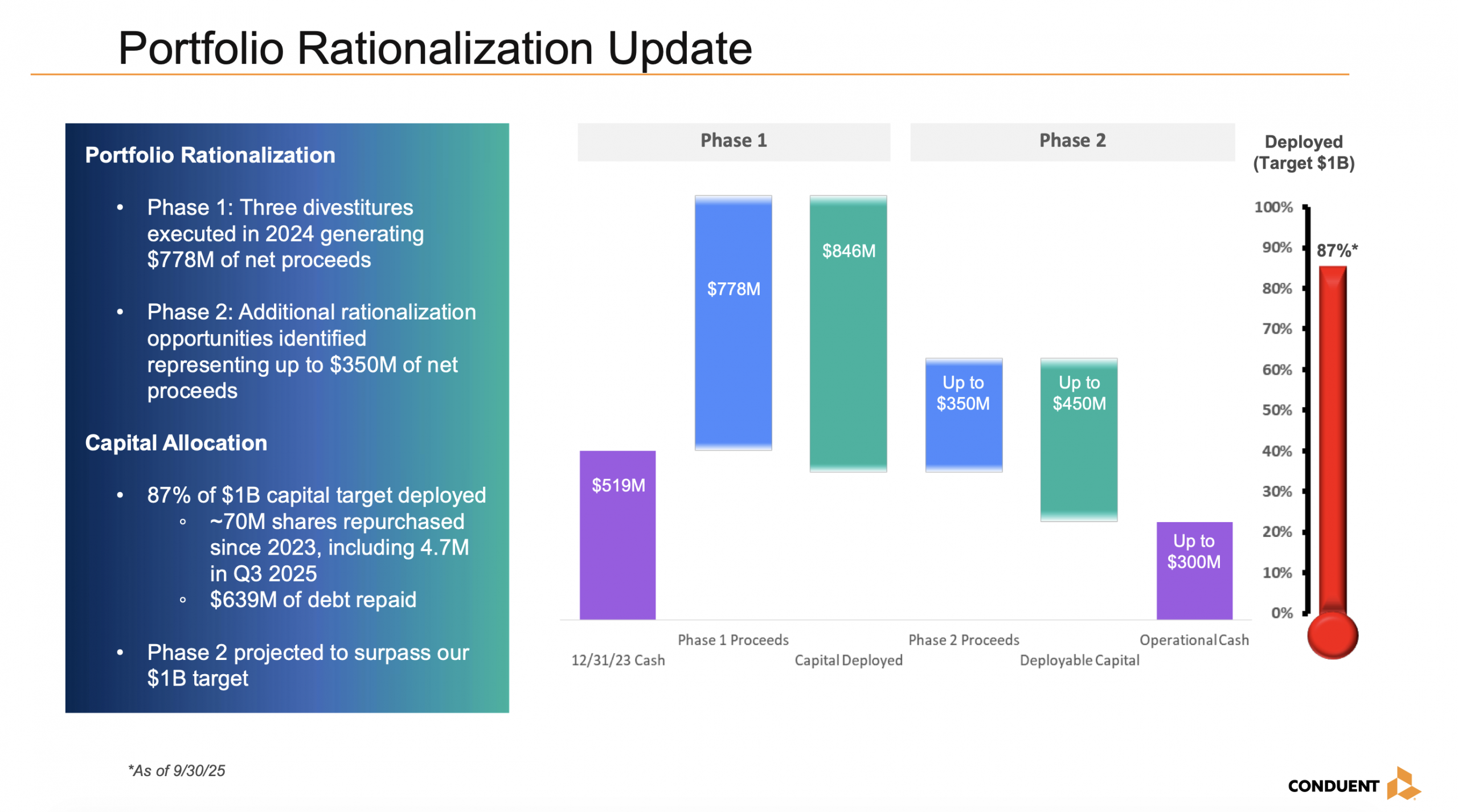 Conduent delivers digital business solutions and services to 50% of Fortune 100 clients and 46 of 50 states. New management has undertaken a multi-year transformation, streamlining the operations, increasing enterprise investments, rebuilding sales pipeline, and divesting non-core assets. Phases 1 of the portfolio rationalization generated $778M of net sales proceeds that were used to enhance the balance sheet, reducing outstanding debt through 2029 and buying back more than 30% of outstanding shares. During the upcoming year, management will focus on reducing stranded costs and completing phase 2 of the portfolio rationalization that should lead to improving margins, further debt reduction, and accretive share buybacks.