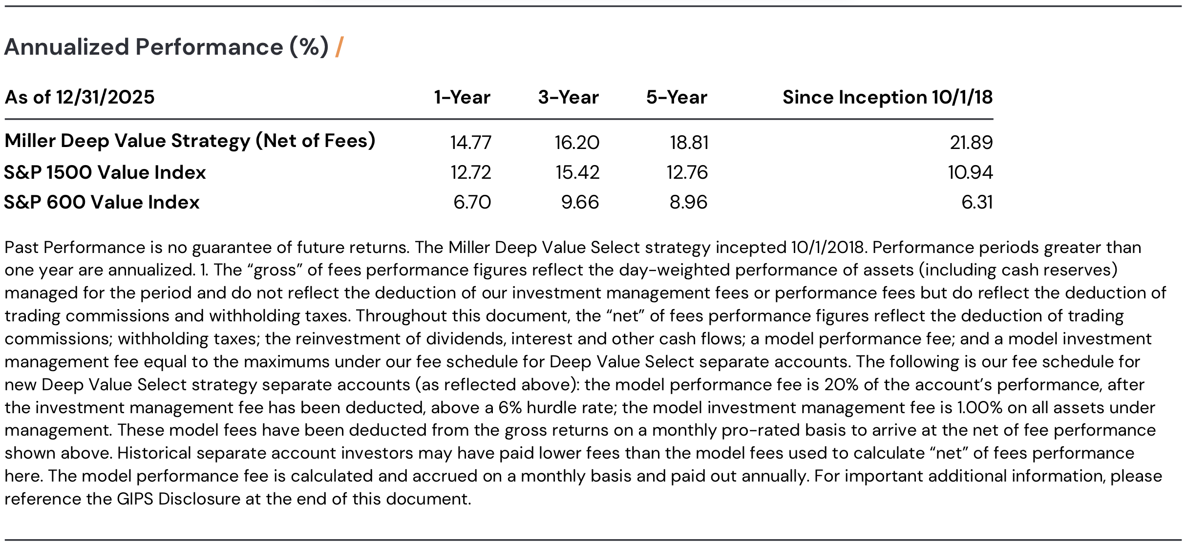 During the quarter, the Deep Value Select strategy returned +5.09%, versus the S&P 1500 Value Index at +3.15% and the S&P 600 Value Index at +3.42%. For 2025, Deep Value Select Strategy net returns are +14.77%, ahead of the S&P 1500 Value Index at +12.72% and ahead of the S&P 600 Value Index at +6.70%. This was the seventh consecutive year of positive returns for the strategy. Since inception, the strategy has annualized net returns of 21.89%, versus 10.94% for the S&P 1500 Value Index and 6.31% for the S&P 600 Value Index.