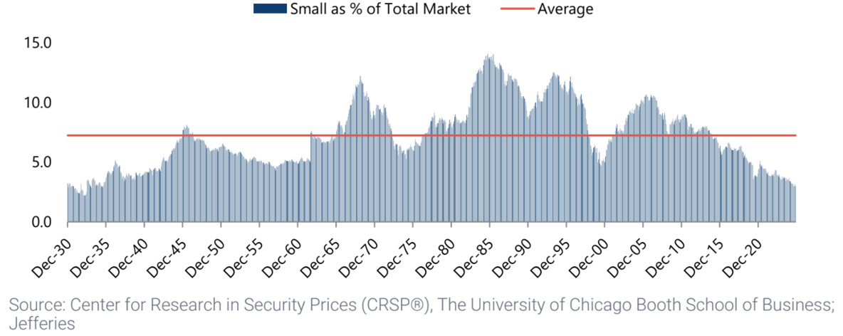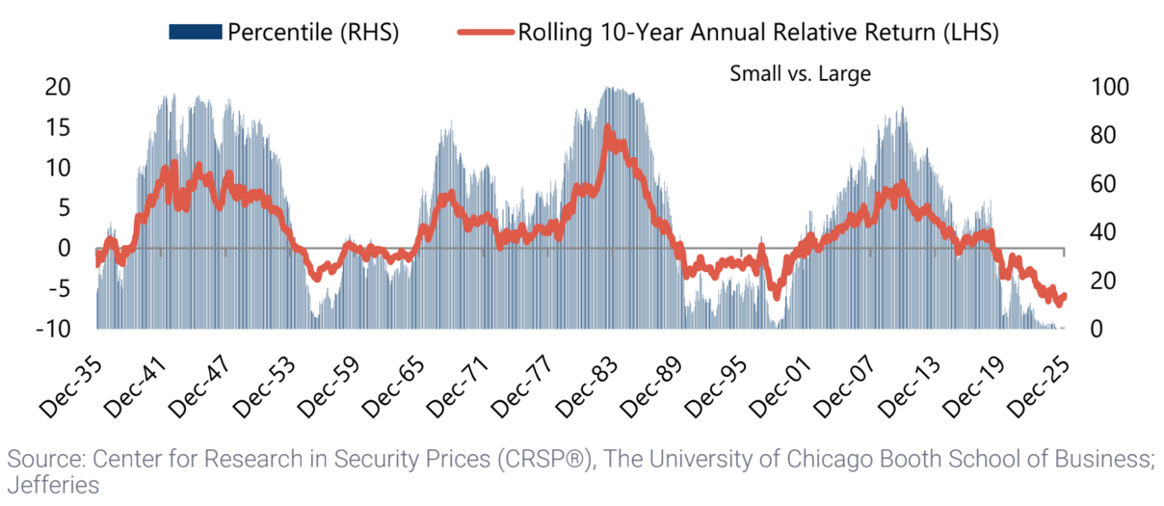 It has been a long 10-year underperformance cycle for small caps. The late 1990s was the last cycle trough which eventually ended as relative valuation multiples narrowed from historical extremes. To start 2026, we are back in the first percentile looking at rolling 10-year performance for small caps versus large caps.