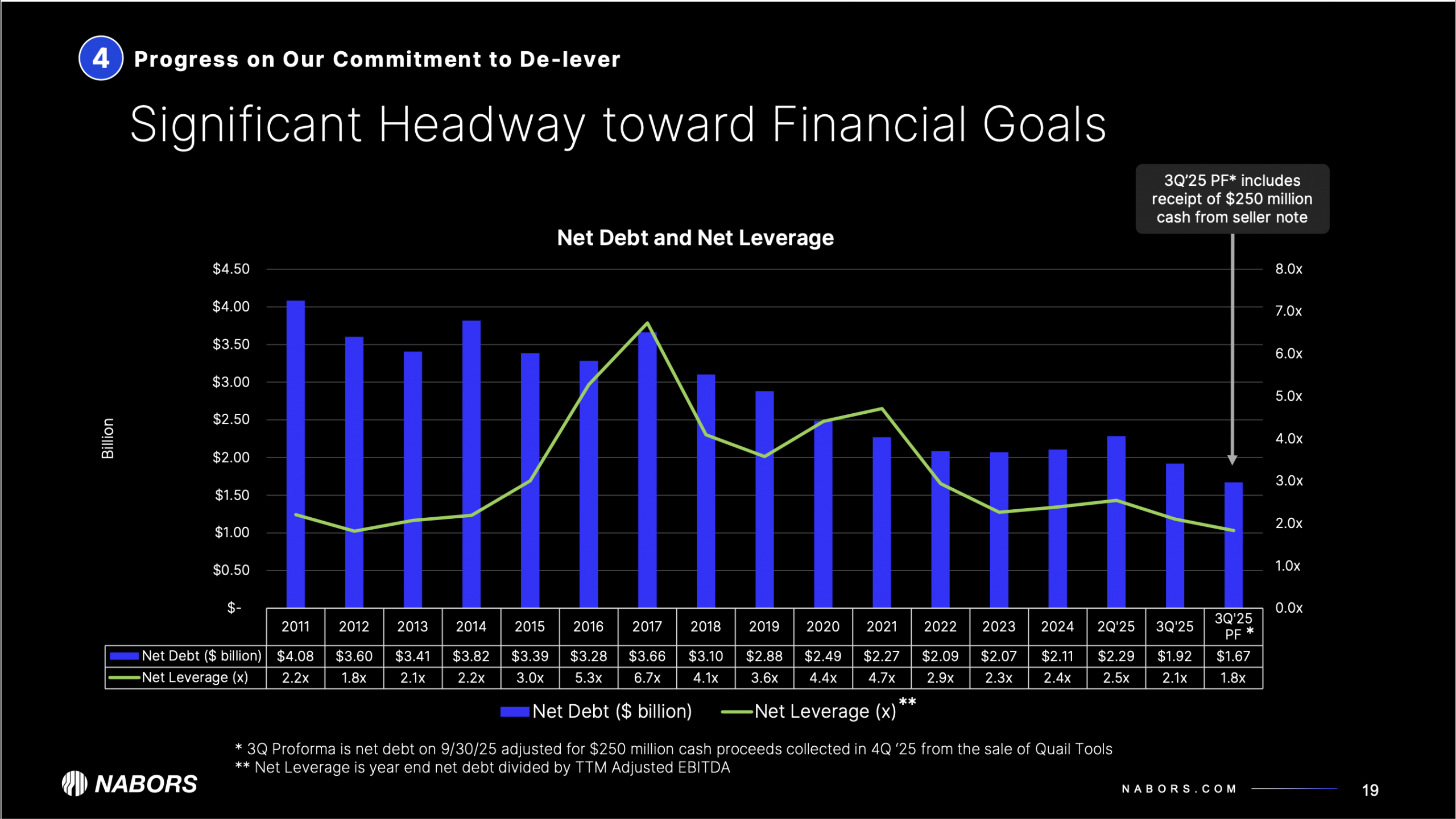 However, equity sell-side analysts continue to cite excessive debt leverage, providing investors with a nice ongoing variant. Nabors looks well positioned to benefit from any pick-up this year in global rig demand, ongoing expansion of their low capital-intensive drilling solutions and scaling their 50-rig program with SANAD. Management achieving 2025 guidance and ongoing debt reduction could support Enterprise Value to EBITDA (forward 1-year) below 3x, near an all-time low and a significant discount to Nabors 15-year average of 5.9x. While oil prices falling towards $50/barrel is a potential risk, we believe this marketplace fear is well known and significantly discounted in Nabors current share price today. Nabors long-term upside potential is still meaningfully above the current share price with the shares currently trading near 1x cash flow and greater than 50% normalized free cash flow yield.
