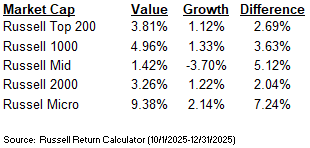 During the fourth quarter, value outperformed growth equities by 269-724 bps across all market caps.