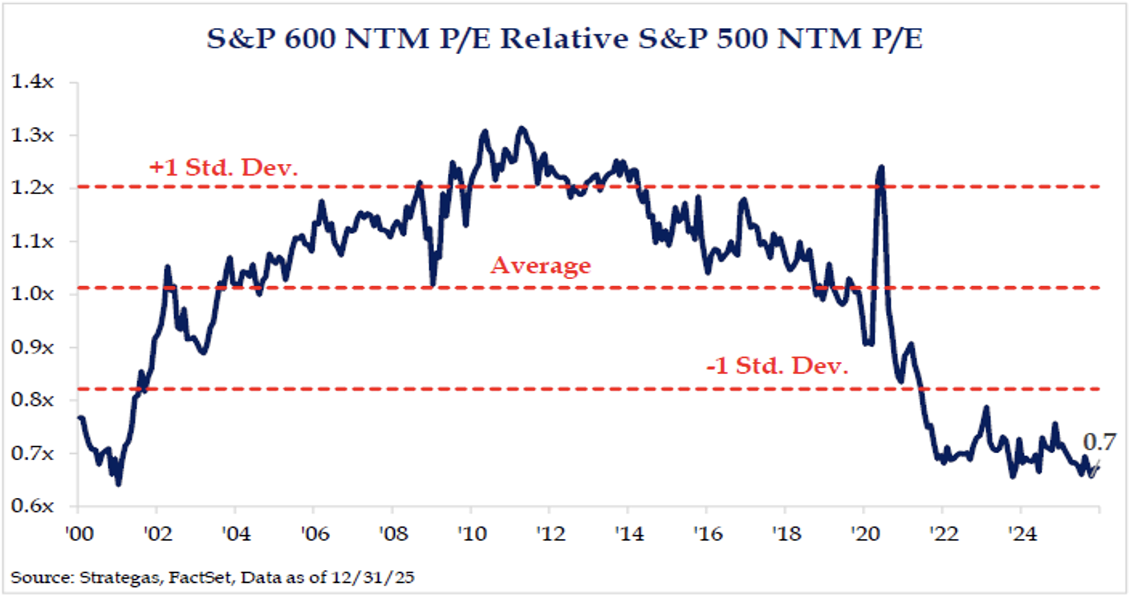 In addition, looking at relative valuation, small caps forward 1-year price to earnings multiples are at a 30% discount to large caps. Current levels are nearly two standard deviations from the historical average, near similar levels to 2000 time period.